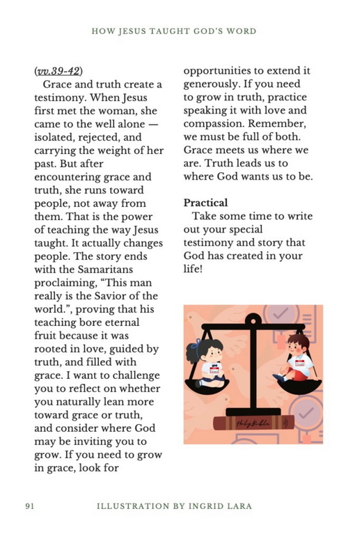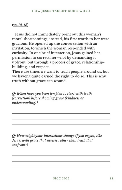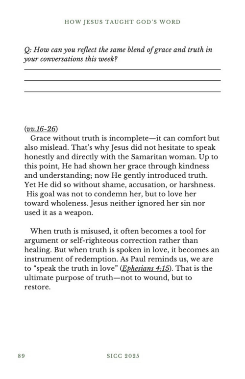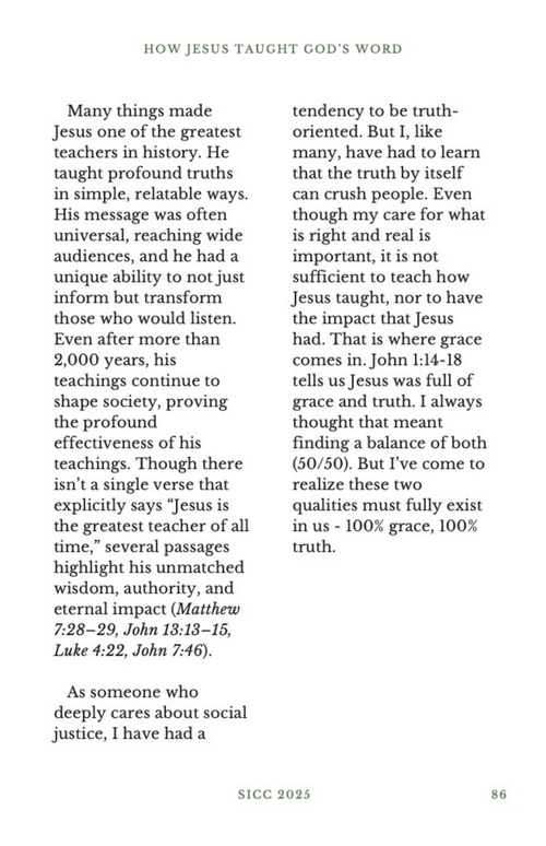 This was Amazing!!! Grace and Truth the two things we need to impact others who need to experience Gods presence. This can go overlooked in many ways I love how it said we need both qualities to exist in us 100% FULLY. I love the story of Jesus sitting with the Samaritan woman at the well, he didn’t think highly of himself or superior while doing it as well! It shows me who are we even as disciples of Jesus to think we’re above others who need Gods love. Jesus knew others may have thought it was unholy to sit with her but did he care? He showed great humility in his interaction with others and his heart posture was humble. Having this love for others changes everything!